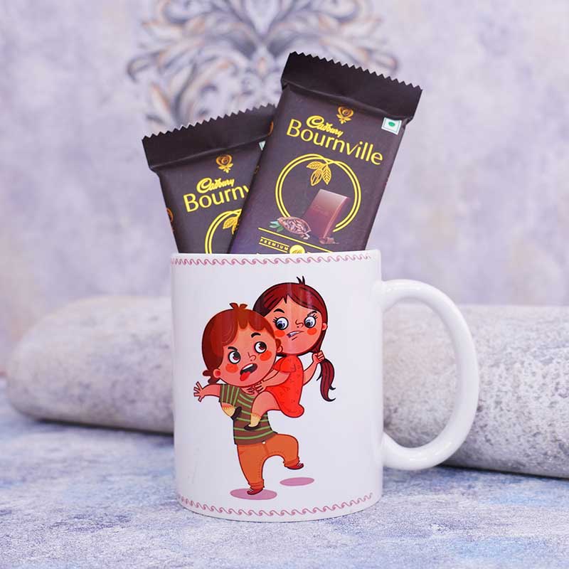 Surprise your brother with this amazing gift hamper with Rakhi with mug hamper that has delicious dark chocolates, a mug with an image of teasing brothers and sisters. Order this now and celebrate this festival with fun and excitement.